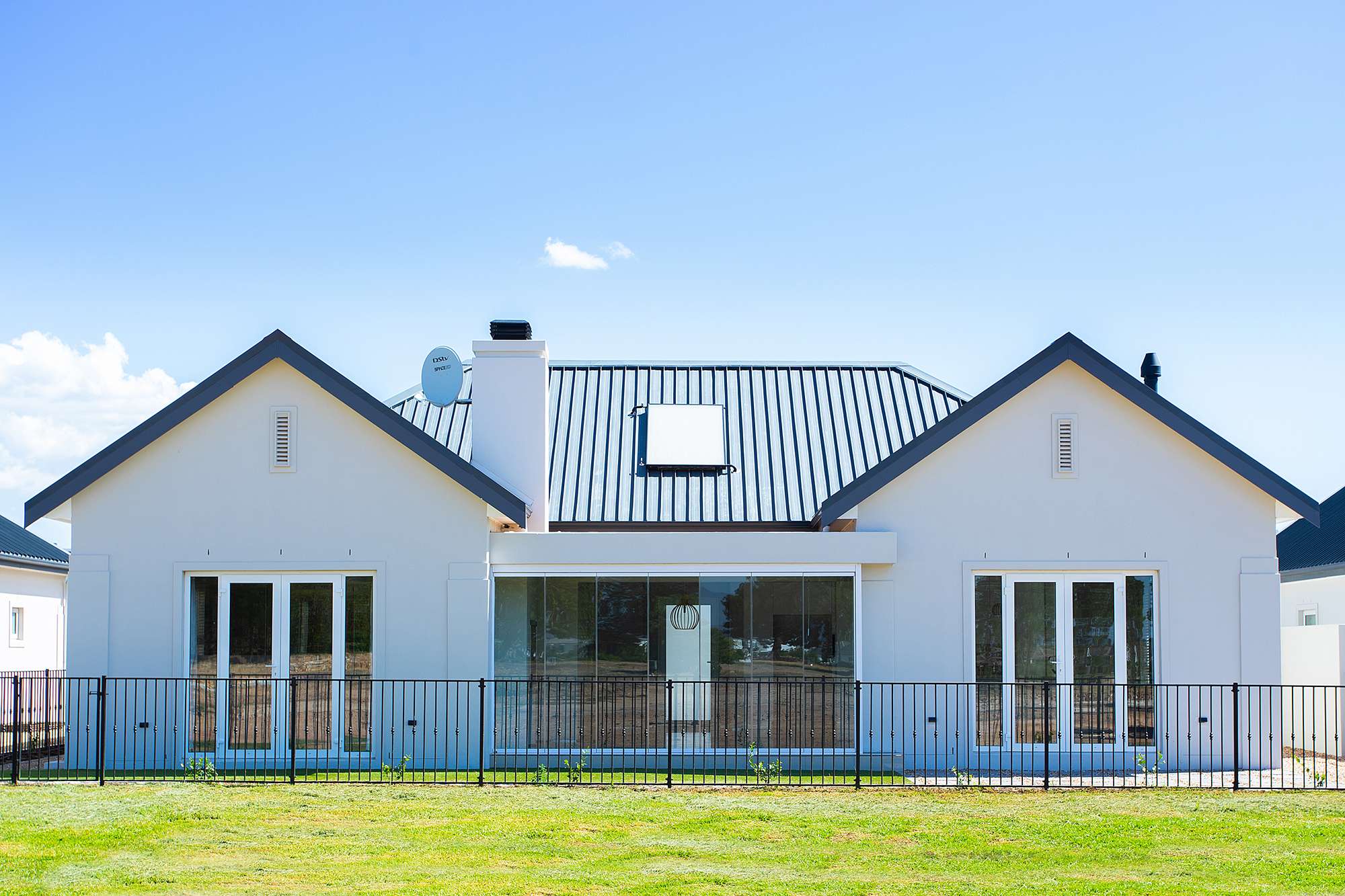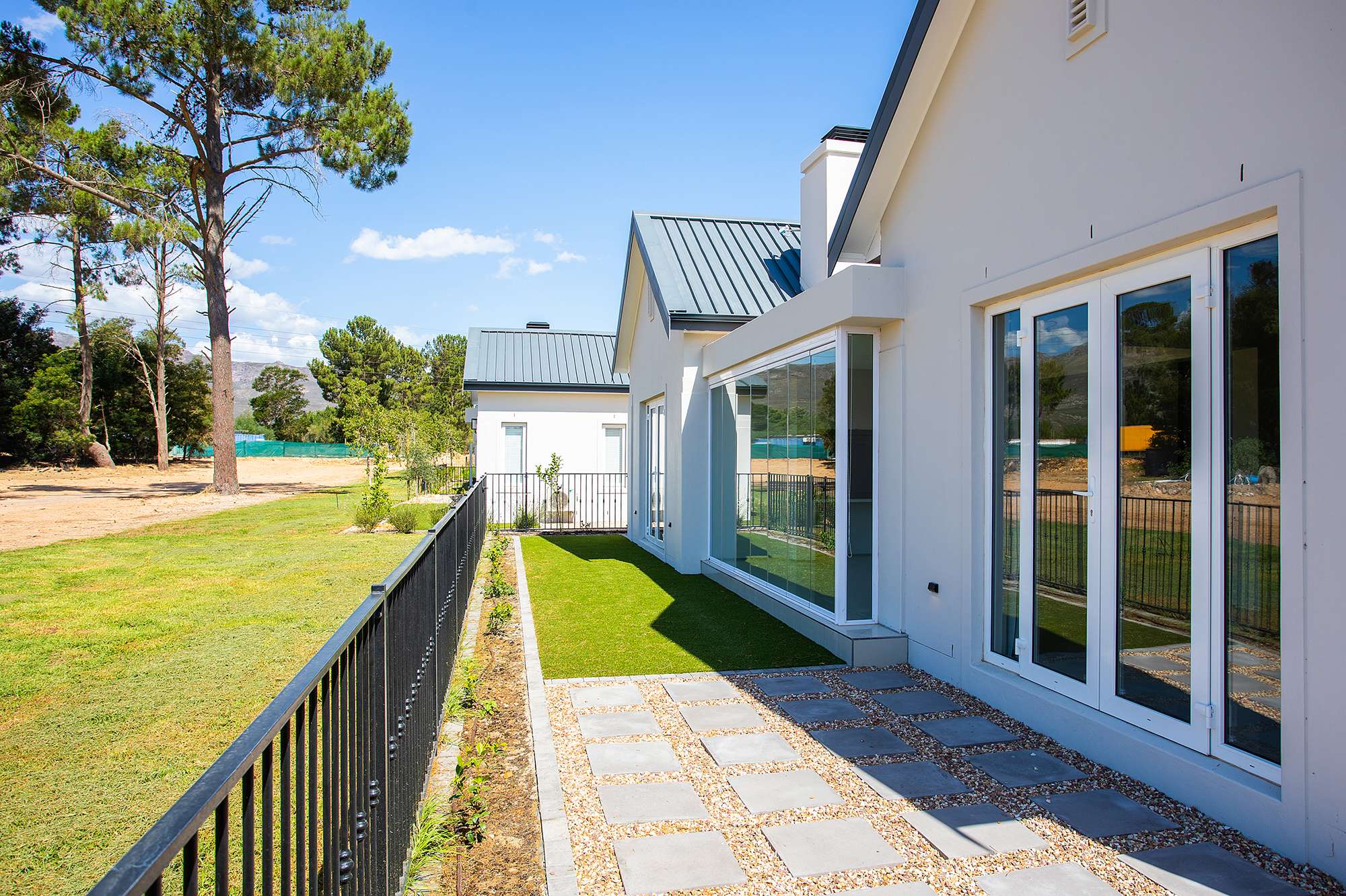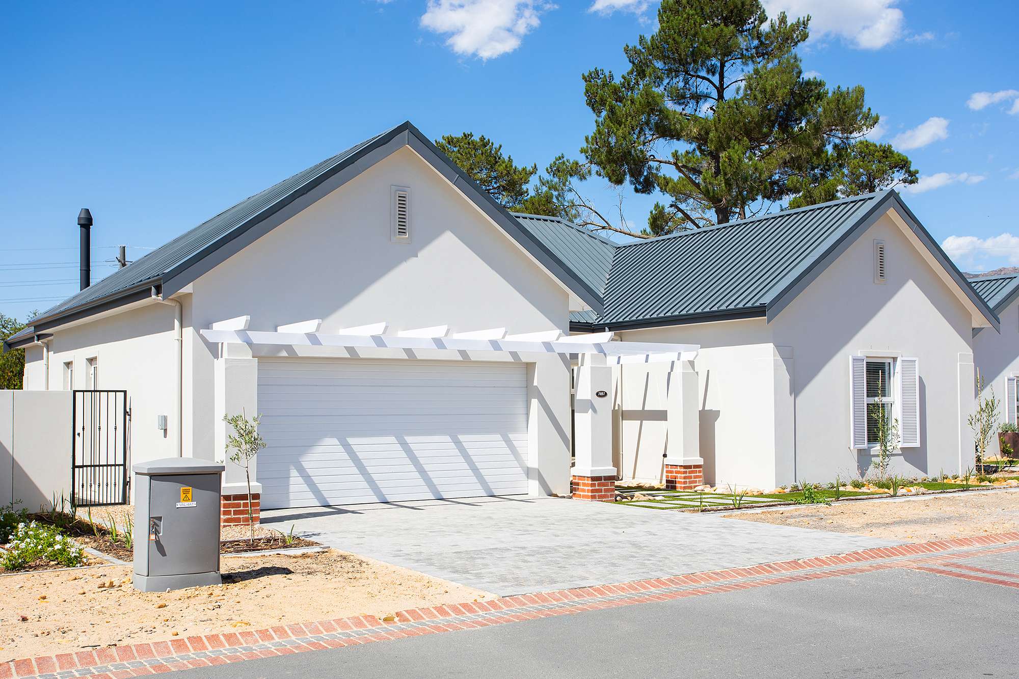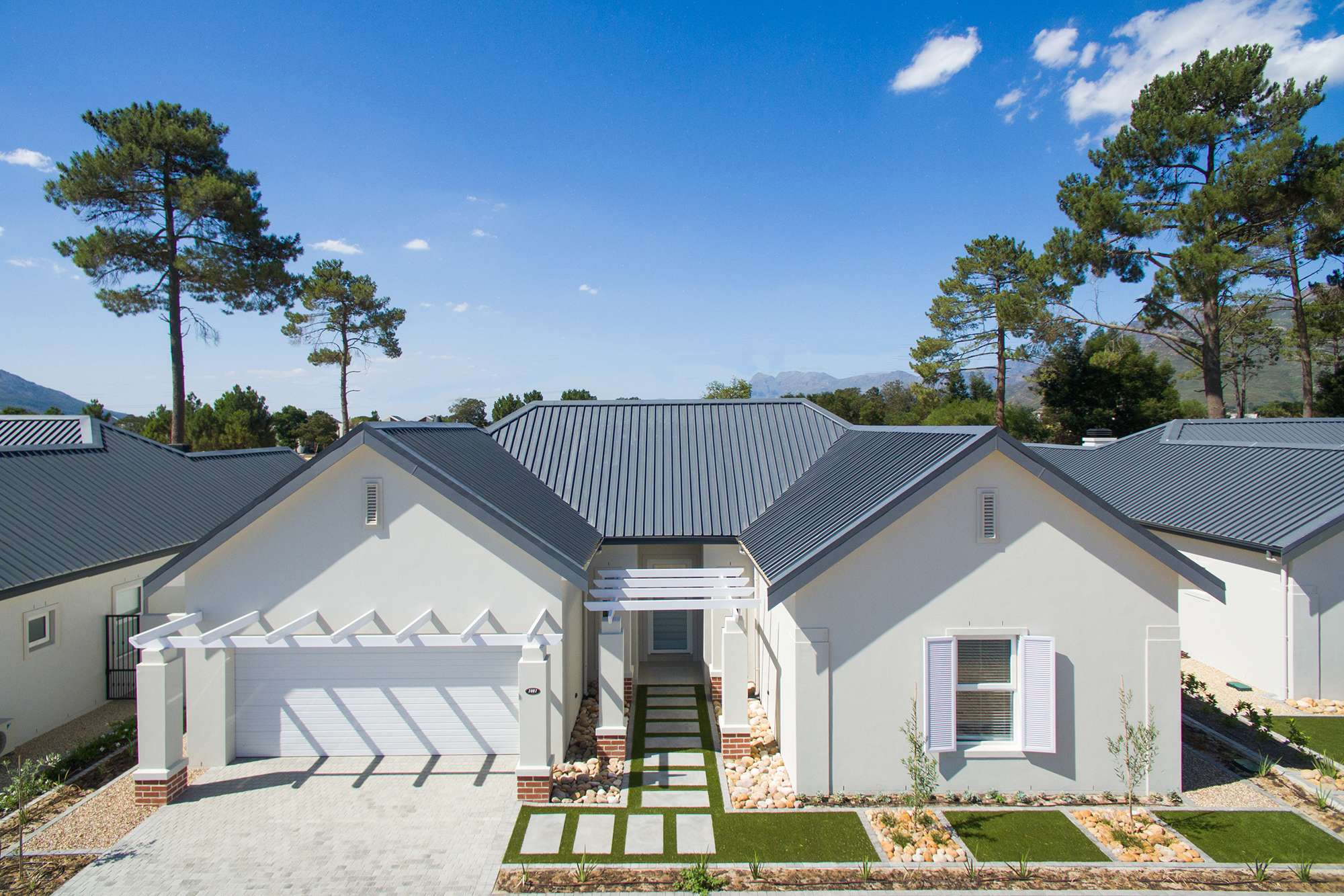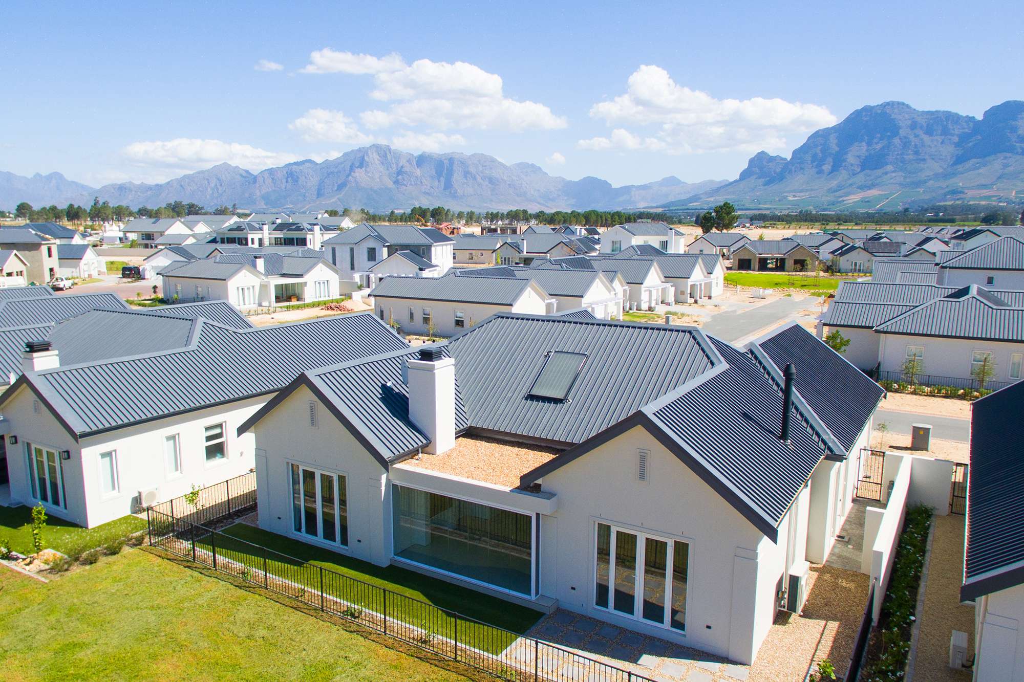 Highly spec’ed Le Domaine Vines at Val de Vie Estate lock up and go north facing home. This home is designed for low maintenance and low energy demands in mind, with double glazed European engineered uPVC windows and doors, solar water heating system, LED lighting controlled by MyLights automation. It boasts modern tasteful fittings throughout with a wood burning combustion fireplace and stainless-steel braai. Heating and cooling is done with a smart MyAir central air-conditioning system. The garden follows the theme of low maintenance with water wise plants irrigated by an automated irrigation system and Easigrass synthetic lawn. The home is complemented with an open plan contemporary kitchen with Caesarstone tops, separate scullery and Smeg appliances which includes; Integrated microwave, freestanding gas oven, electric hob and extractor.